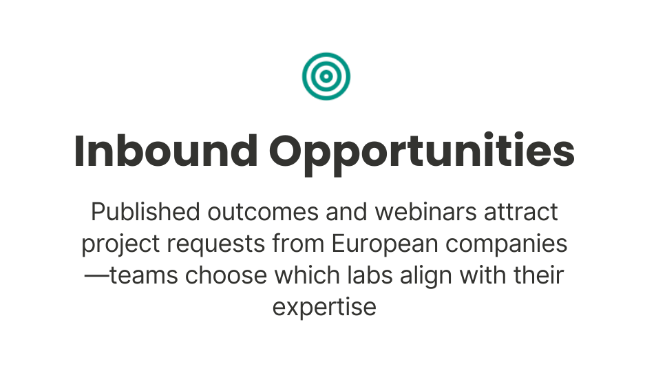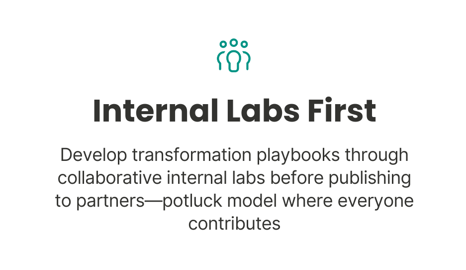 Collaborate on internal R&D labs to develop playbooks and MVPs first. Publish outcomes, attract project requests, choose which challenges you want to solve—all under a collective brand where everyone contributes to the potluck.