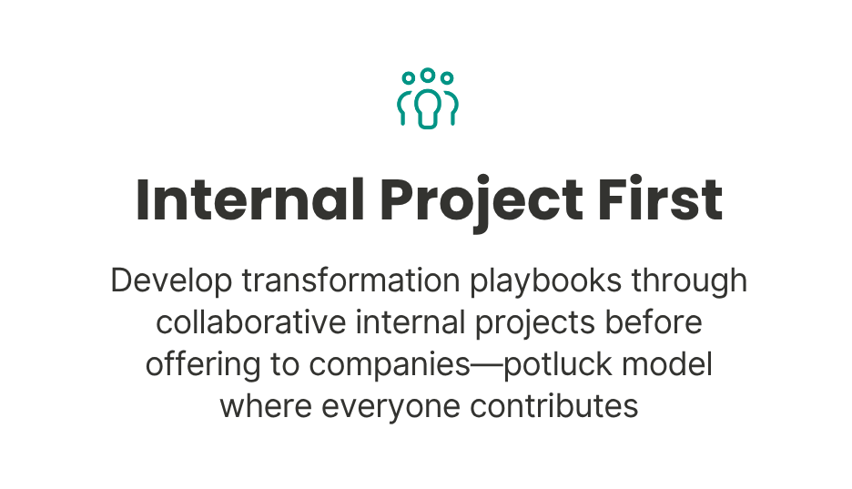 Collaborate on internal projects to develop playbooks and MVPs first. Publish outcomes, attract project requests, choose which challenges you want to solve—all under a collective brand where everyone contributes to the potluck.